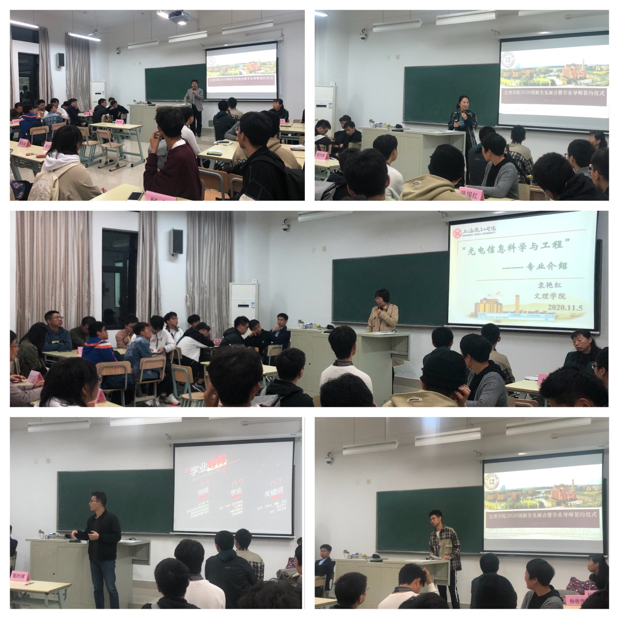 2020年11月5日晚,太阳成集团tyc151cc2020级新生见面会暨学业导师签约仪式在临港校区A教202顺利举行。太阳成集团tyc151cc院长朱泰英,直属党支部书记康秀珠、副书记袁亮,光电信息科学与工程专业负责人袁艳红、光电2011班级的学业导师以及全体学生参加了本次会议。会议由袁亮主持。