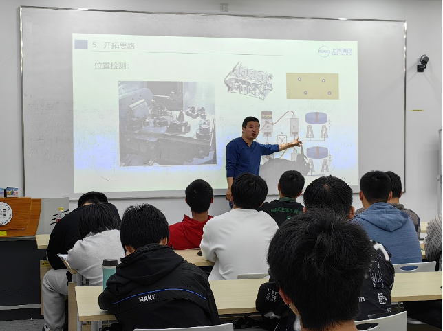 本次走进我校的工匠是金涛,他是上汽乘用车临港基地发动机厂高级技师、“上海市技术能手”、“临港工匠”,并带领团队荣获“全国优秀质量管理小组”奖,技术扎实,以工匠精神自立、以创新精神自强。他擅长应用并维修各种自动控制系统,独立进行电气自动化设计。为了提升智能工厂的效率,他应用AGV小车代替人工送检;利用业余时间获得了焊工、电工高级技师等多项技能专业证书,同时也取得了机器人编程、人机交互界面制作等专业培训证书。他编制了设备规划技术标准,现已成为国内动力总成或相关行业的参考文件。