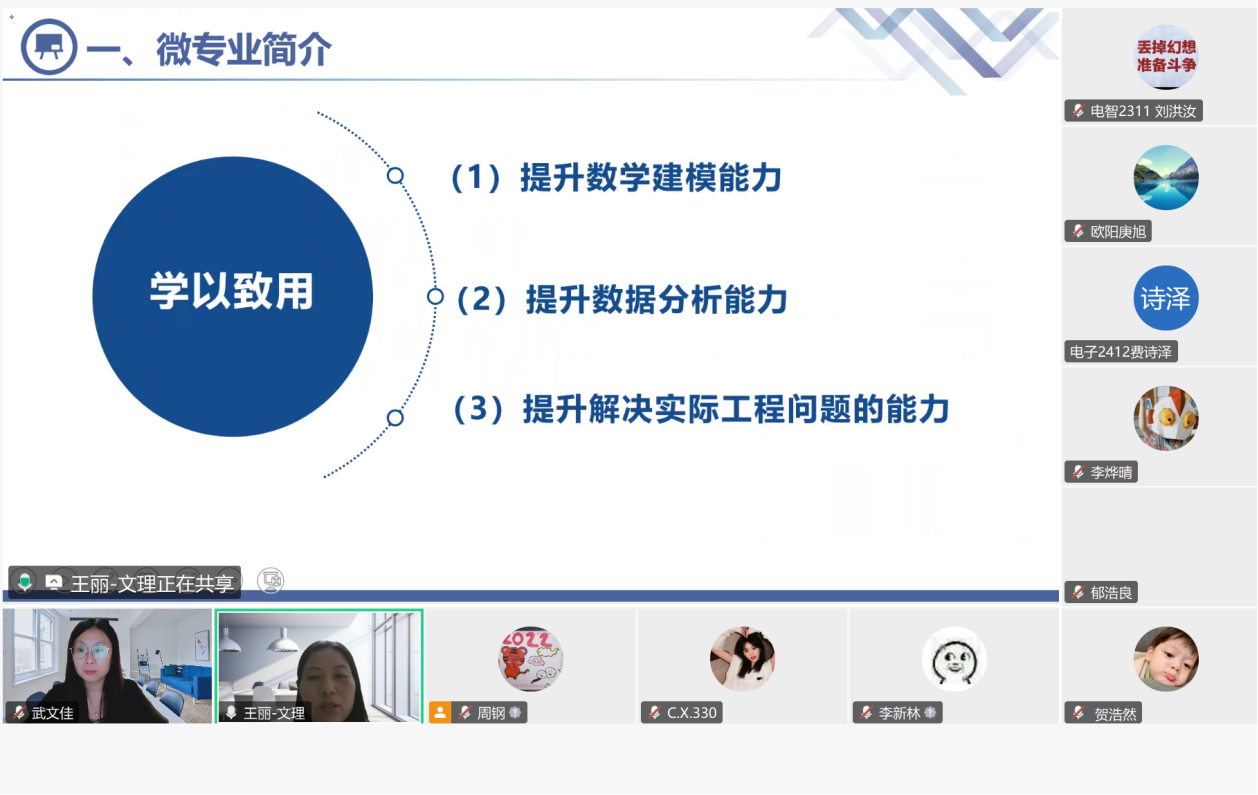 王丽向微专业学生详细介绍了本专业“学以致用”的专业建设特色,并对本专业的培养方案、学制学分、课程体系、教师团队、毕业要求及发展愿景进行了详细解读。团队其他老师向学生们介绍了各微专业课程的主要授课内容、授课方式和课程安排,强调了微专业的核心理念“用数学知识解决工程实践中的实际问题”,并鼓励大家积极参加数学建模竞赛,以赛促学。
